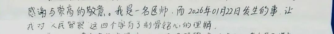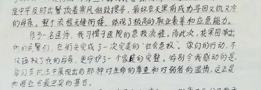 她动情地写道:“作为一名医师,我习惯于医院的急救流程。而此次,民警们在街头完成了一次完美的‘社会急救’。你们的行动,不仅拯救了我的母亲,更守护了一个家庭的完整。特别令我感动的是搜寻中展现出的对生命的尊重和对弱者的温情,这正是和谐社会最坚实的基石。”