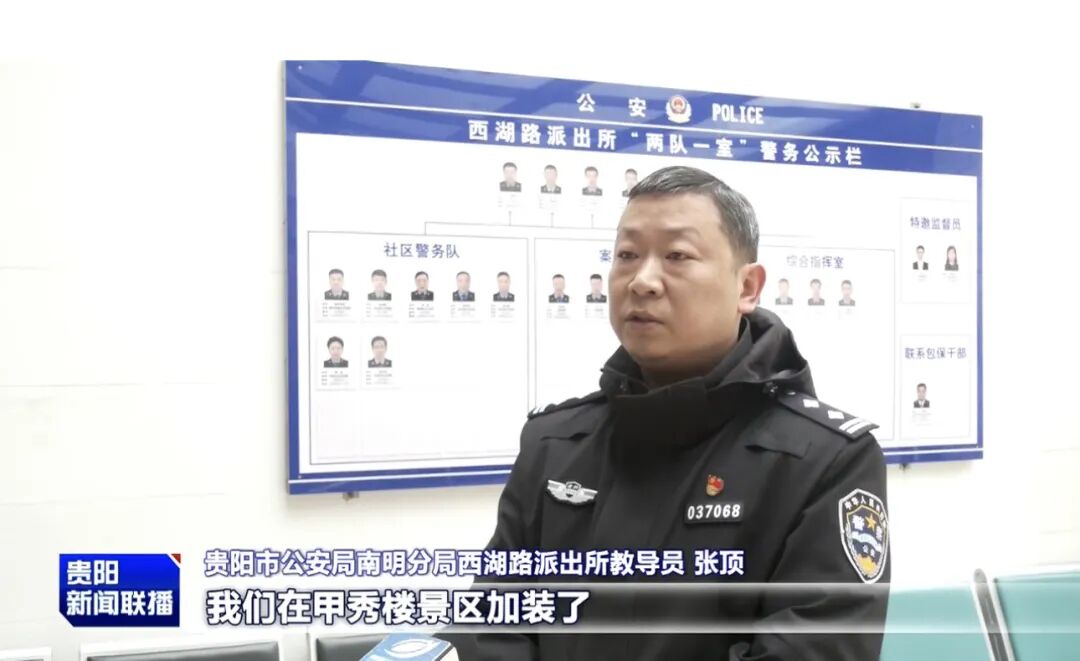 贵阳市公安局南明分局西湖路派出所教导员 张顶:另外我们在甲秀楼景区加装了24个可视的对讲高清视频监控和4个AI流量监测监控,实现了对甲秀广场治安态势的实时感知和科学调度警力。当甲秀楼的人流达到阈值的时候,我们就会紧急启动我们的应急预案,采取单循环的方式,防止甲秀楼因人员拥堵出现踩踏等各种安全事故。