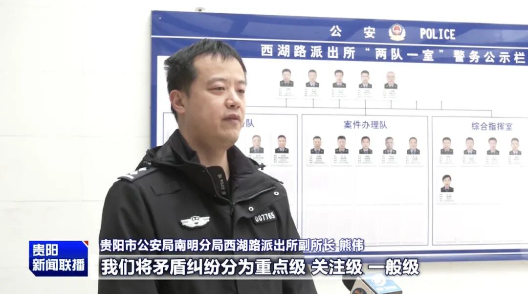 贵阳市公安局南明分局西湖路派出所副所长 熊伟:我们将矛盾纠纷分为重点级、关注级、一般级,对排查出的矛盾纠纷,根据性质和复杂程度,采取“警民联调”、“司法确认”、“专业介入”等多种方式,努力实现“矛盾不上交、平安不出事、服务不缺位”。