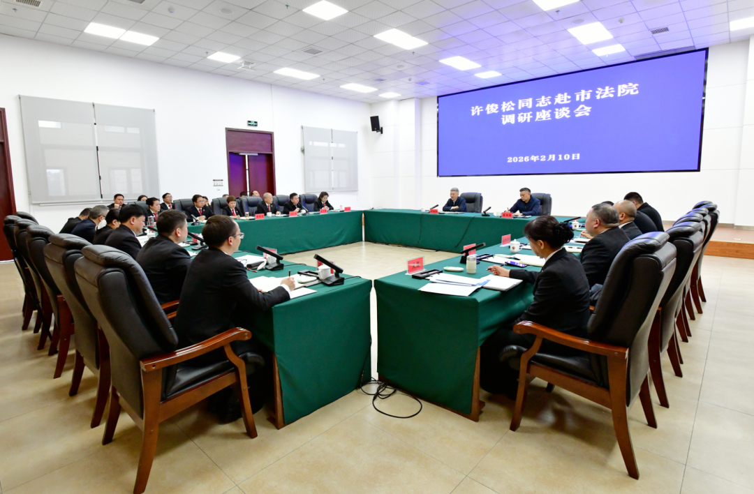 在随后召开的座谈会上,许俊松听取市法院工作情况汇报,对全市法院工作成效给予充分肯定。他强调,要强化政治引领,坚持党对法院工作的绝对领导,把讲政治作为第一要求,把政治建设融入司法审判全过程,把讲政治和讲法治统一起来,坚持“从政治上看、从法治上办”,不断提高“政治三力”。要强化服务大局,自觉把各项工作置于经济社会发展大局中谋划落实,紧扣市委加快建设“六个贵阳贵安”的战略部署,找准切入点和着力点,充分发挥司法职能作用,以法治方式动真碰硬纠治破坏营商环境的顽瘴痼疾。要强化司法为民,站稳人民立场、厚植人民情怀,紧盯重点领域、重点群体、重点问题,加大打击力度,深度融入综治中心规范化建设,依法化解涉法涉诉矛盾纠纷,更好推动解“法结”、化“心结”,让司法为民直达人心。要强化公正司法,依法平等保障各方的诉讼权利、合法权益,在法律框架内进行情理法的综合考量,把冷冰冰的法律条文转化为暖人心的法律服务,让法律有力度更有温度,实现“三个效果”有机统一。要强化案件质量,坚持以案件质量为中心优化评估指标体系,完善案件质量评查机制,加大案件评查力度,对重大案件加强监督指导,努力让人民群众在每一个司法案件中感受到公平正义。要强化问题攻坚,运用好大数据和科技赋能,用创新思维、改革办法破解好案多人少难题,全面落实司法责任制,推动案件办理繁简分流、轻重分离、快慢分道,用专业、热情、周到的服务提升群众满意度。要强化宣传引导,深入挖掘执法办案、司法改革、服务群众的先进人物和感人事迹,生动讲述法院故事,展现法院队伍的主流正气和时代风采,着力营造崇尚法治、信任司法的良好社会氛围。要强化队伍建设,履行好全面从严管党治警政治责任,坚持严管厚爱,教育引导干警树立和践行正确政绩观,自觉为人民出政绩、以实干出政绩、计长远出政绩,狠抓纪律作风建设、能力素养提升,确保队伍信得过、靠得住、能放心。